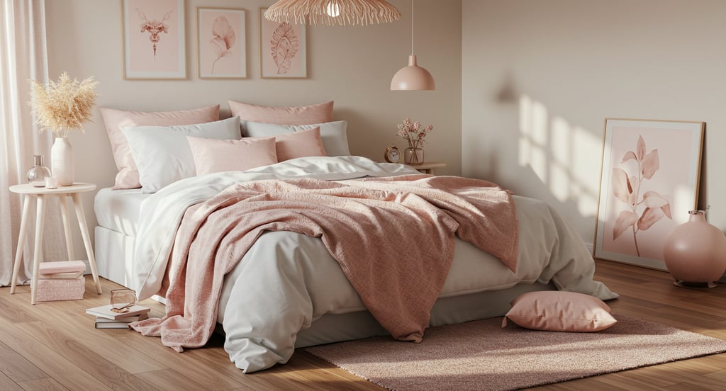 For a cohesive look, add functional pieces like blush-toned drawers or nightstands. These pieces balance practicality with subtle color and can tie the whole room together.