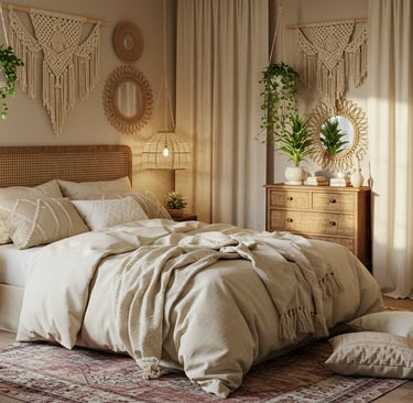 Boho bedroom styling is about embracing texture, layering comfort, and letting personality shine through small details. Combine soft neutrals with handcrafted pieces and woven finishes to create a tranquil space that feels both relaxed and intentional. Whether you start with a cozy comforter, a macrame tapestry, or a statement rattan lamp, every element adds warmth and character to your boho retreat.