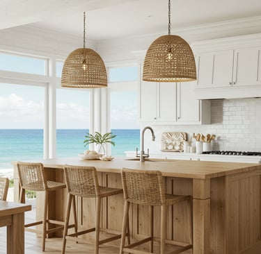 Counter stools set the tone for your kitchen seating. Coastal styles often feature rattan, light wood, or soft neutral upholstery that feels casual yet refined.