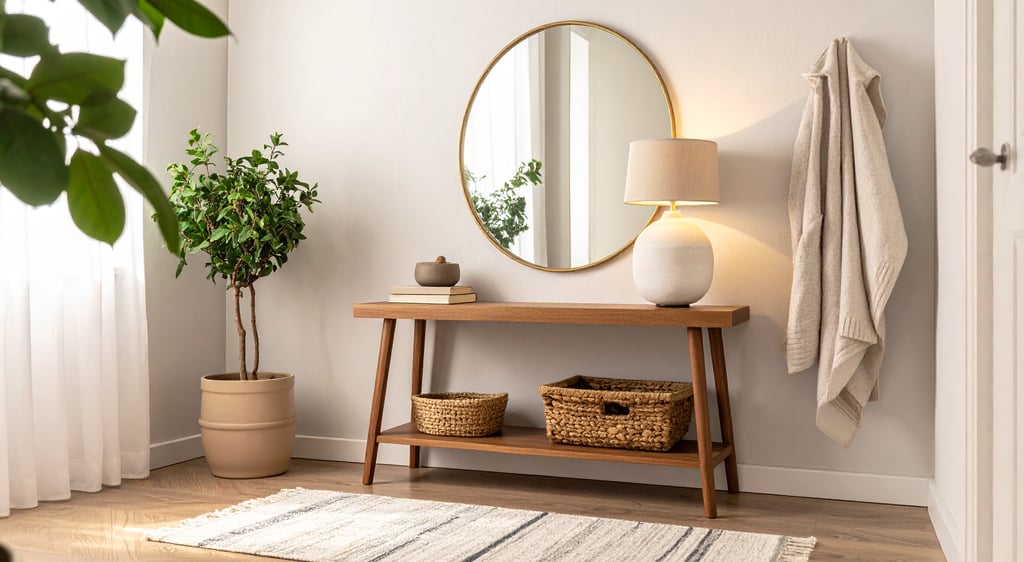 Even in very small entryways, a narrow console table or floating shelf helps define the space and makes it feel intentional.