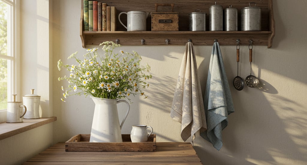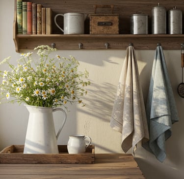 It’s the finishing touches that make a rustic kitchen feel like home — soft linens, practical organization, and warm textures.