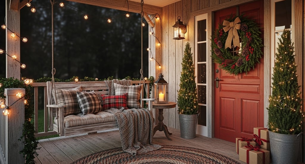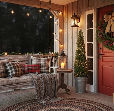 Create a cozy, glowing atmosphere with lanterns and twinkling lights that make your porch feel like a festive retreat.